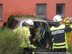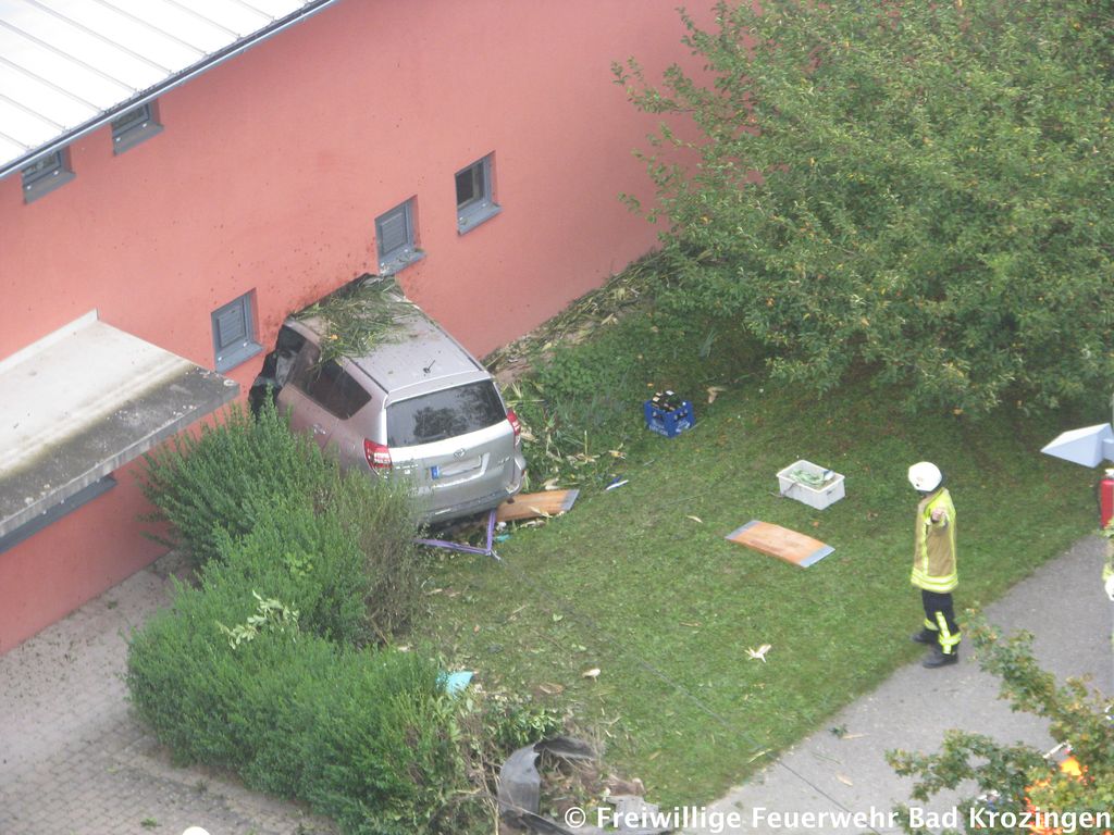 Gegen 10:00 Uhr wurde die Freiwillige Feuerwehr Bad Krozingen zu einem Verkehrsunfall nach Biengen alarmiert. Ein PKW war auf der Verbindungsstraße zwischen Bad Krozingen und Biengen von der Straße abgekommen, durchquerte mehrere hundert Meter zunächst ein Maisfeld samt angrenzenden Acker, dann einen Parkplatz und krachte schließlich in die dahinterliegende Merowinger Halle. Hier durchbrach er die Mauer und kam schließlich zum stehen. Der Fahrer wurde eingeklemmt und musste durch die eingesetzten Kräfte befreit werden.