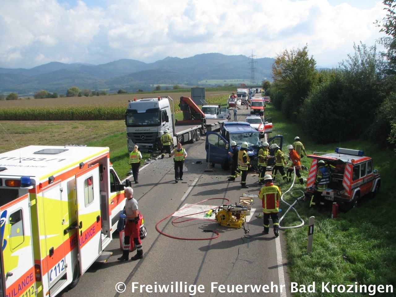Die Freiwillige Feuerwehr Bad Krozingen wurde kurz nach 14 Uhr zu einem schweren Verkehrsunfall auf der Bundesstraße 3, Ortsumfahrung Richtung Staufen alarmiert. Ein PKW (Van) stieß frontal mit einem LKW zusammen. Die Person im PKW war schwer eingeklemmt und wurde mit technischem Gerät durch die Feuerwehr befreit. Aufgrund der Schwere der Verletzung ist die Person leider jedoch noch an der Unfallstelle verstorben. Die Freiwillige Feuerwehr Bad Krozingen war mit Ihrem Rüstzug mit 4 Fahrzeugen und 18 Feuerwehrangehörigen sowie dem Notfallseelsorger im Einsatz.