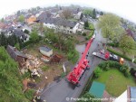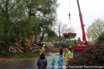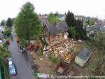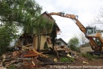 Wenig später ordnete allerdings die Polizeibehörde- die noch stehenden Gebäudeteile hatten sich im Nachhinein als extrem windgefährdet erwiesen- den sofortigen Notabriss dieser Teile an. Und so wurde die FF Bad Krozingen, zunächst noch vom neuen „Kranzug“ der Berufsfeuerwehr in Freiburg, der sich gerade zu Lehrgangszwecken am Gerätehaus der Kernstadt befand, unterstützt, und ein Zug des Ortsverbandes des Technischen Hilfswerkes aus Müllheim in die Kapellenstraße zurück beordert. Einsatzstichwort diesmal: „Amtshilfe“ . Je etwa20 Einsatzkräfte von Feuerwehr und THW waren im Einsatz. Unter Zuhilfenahme eines von einer Privatfirma heran beorderten Greifbaggers und mit einem Wechselladerfahrzeug an- und abgefahrenen Containern wurde das Gebäude, das nach Zeugenaussagen schon seit etwa zwei Wochen in diesem-vor allem für spielende Kinder- lebensbedrohlichen Zustand herumstand, dann endgültig geschleift. Da der Verdacht bestand, das bereits abgebrochene Material und die noch stehenden Gebäudeteile könnten den bekannten Schadstoff Asbest enthalten, wurden sämtliche Abbruch- und Verladearbeiten unter dem Einsatz von mehreren Strahlrohren durchgeführt. So konnte eine potentiell bedrohliche Staubentwicklung weitestgehend verhindert werden. Sowohl der den Gesamteinsatz leitende Jürgen Bleile, als auch der verantwortliche Einsatzleiter des THW sprachen im Nachhinein von einer ausgezeichneten Zusammenarbeit beider Rettungsorganisationen bei diesem eher ungewöhnlichen Einsatz.