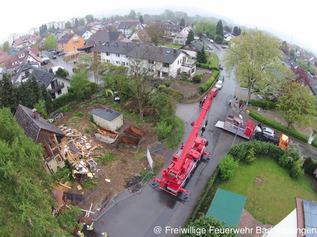 sm Samstag den 25.04.2015 am frühen Nachmittag wurde die Feuerwehr Bad Krozingens innerhalb kürzester Zeit zweimal zur selben Einsatzadresse in der Bad Krozinger Kapellenstraße gerufen. Die erste Alarmmeldung: „H4-Eingerissenes Gebäude droht einzustürzen“ lies bereits auf nicht Alltägliches schließen.Am Einsatzort eingetroffen machten sich der zuständige Zugführer, der Bad Krozinger Gesamtkommandant ein Bild von der sich bietenden Lage. Da zunächst kein akuter Handlungsbedarf zu erkennen war, wurde die Einsatzstelle an die herbeigerufene Polizei übergeben.
