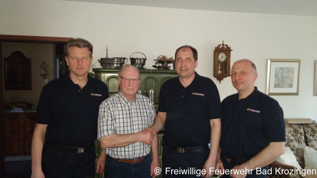 Zum 75. Geburtstag konnte die Feuerwehr Ihrem Mitglied, Oberlöschmeister Adolf Kopf, recht herzlich gratulieren. Adolf Kopf ist am 01. Mai 1963 in die Wehr eingetreten. Als Maschinist eines Löschfahrzeugs und einer der ersten Drehleitermaschinisten in Bad Krozingen nahm er an zahlreichen Einsätzen bis zu seinem Wechsel in die Ehrenabteilung teil. Er absolvierte die Wettkämpfe der Leistungsabzeichen in Bronze, Silber und Gold. Seitens des Landes Baden Württemberg wurde er 2004 zu 40 Jahre aktiven Feuerwehrdienst geehrt. Adolf Kopf war jahrelang als Schatzmeister der Gesamtfeuerwehr tätig. Seit der Übergabe der Fahne an die Feuerwehr im Jahr 1965 durch Bürgermeister Herbert Hellmann und Verwaltungsamtmann Bertold Ruch, ist Adolf Kopf jedes Jahr bei den offiziellen Veranstaltungen in der Fahnenabordung vertreten. Auch wieder dieses Jahr, im Jubiläumsjahr.