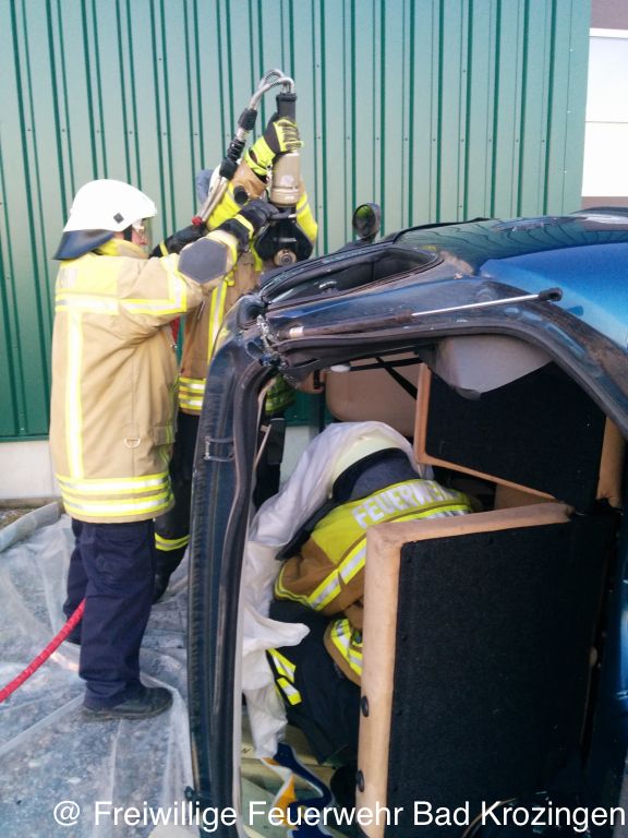 Die anrückenden Kameraden der Feuerwehr Hausen übernahmen die Rettung der im PKW eingeklemmten Person, befreiten diese in dem das Dach des Autos entfernt wurde. Zwei Trupps unter Atemschutz begaben sich in das von Kunstnebel verrauchte Gebäude und suchten dort nach zwei vermissten Personen. Die vermissten wurden schnell gefunden und konnten so gerettet und erstversorgt werden. Im Anschluss wurde die Halle mit Überdruckbelüftern entraucht.