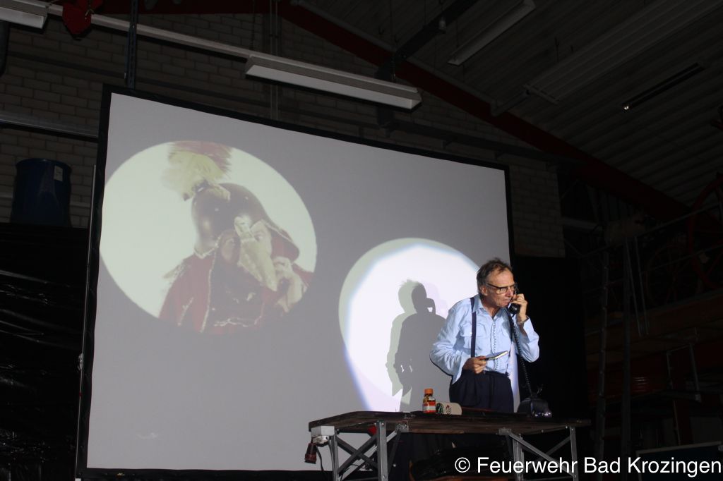 … führte der Schauspieler Manfred Kessler (65) in seiner „Ein-Mann-Show“ am Samstag den 15.08. sein erfreulich zahlreich erschienenes Publikum. Im Rahmen des 150 jährigen Jubiläums der Bad Krozinger Feuerwehr hatte das hier kooperierende Kulturamt der Stadt einen Auftritt des sonst im Rahmen des Kultursommers Rheinland-Pfalz auftretenden Künstlers aus Burgschwalbach( nahe Wiesbaden) organisiert. Die Fahrzeughalle des Bad Krozinger Gerätehauses war zu diesem Zweck in einen kleinen Theatersaal mit (nahezu gleich großem) Foyer umgestaltet worden, der vor und nach der eigentlichen Veranstaltung die etwa 100 anwesenden Gäste zum Verweilen einlud.