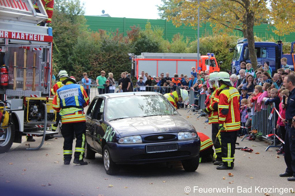 Geladene Gastwehren (Hartheim, Ehrenkirchen und Untermünstertal) zeigten auf einem eigens dafür freigehaltenen Gelände, was abläuft, wenn nach einem Verkehrsunfall an einen eingeschlossenen Insassen nicht so recht heranzukommen ist, oder welche dramatischen Folgen beispielsweise der unsachgemäße Ablöschversuch eines Fettbrandes in der Küche haben kann.