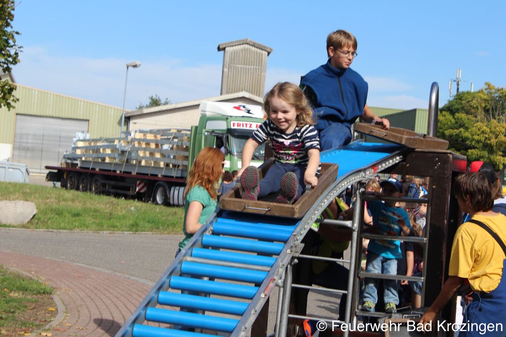 Die hiesige Wehr hatte ein Programm zusammengestellt, das eigentlich keinerlei Wünsche offen lassen konnte. So vielfältig, dass aus der Angebotspalette alles aufzuführen und näher zu beleuchten, den Rahmen eines solchen Artikels deutlich sprengen würde. Was gab es nicht alles zu sehen und zu erleben! Die Allerkleinsten hatten die Gelegenheit, sich an einem großen Sandhaufen schöpferisch zu betätigen, schon etwas größere Kinder drehten als Beifahrer schon einmal mit einem „Quad“ des Technischen Hilfswerkes eine Runde. Eltern, Großeltern und Kinder nahmen an Rundfahrten mit Einsatzfahrzeugen teil, ja selbst ein Rundflugangebot mittels Hubschrauber hatte die veranstaltende Wehr zu organisieren gewusst. Neugierige konnten sich über die persönliche Ausrüstung eines Feuerwehrangehörigen informieren, eine Fahrzeugausstellung vermittelte (im Falle der Drehleiter sogar zum Anfassen) einen Eindruck von der Leistungsfähigkeit der gezeigten Einsatzvehikel. Im „Mauskino“ liefen in regelmäßigen Abständen einschlägige Filme aus der bekannten Fernsehserie. Sehr gut besucht auch die von der Jugendfeuerwehr betreuten Angebote, wie etwa die Spielstraße, die Bierkastenrutsche und vieles andere mehr. Praktische Übungsmöglichkeiten gab es am sog. „Fire-Trainer“, an dem übrigens in regelmäßigen zeitlichen Abständen auch höchst eindrücklich der Zerknall einer in´s Feuer geratenen Spraydose demonstriert wurde.