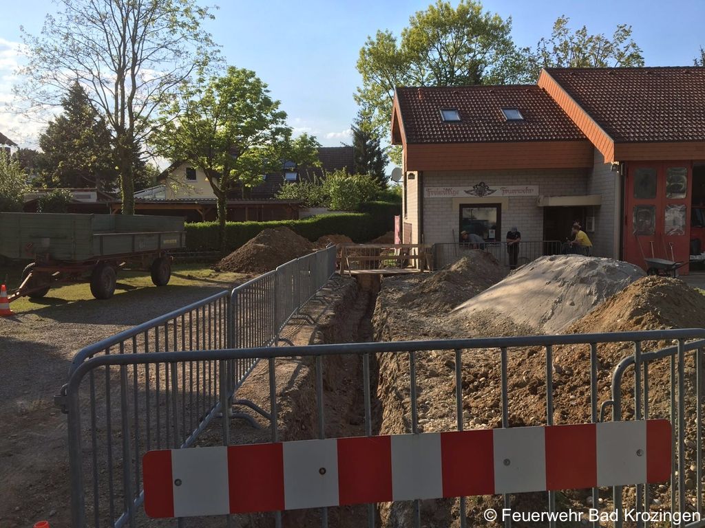 Im Außenbereich wird sichtbar, was die Kameraden sonst noch so leisten. Die Rohrleitungsgräben für die neuen Gas-, Wasser- und Stromleitungen wurden ausgebaggert und nach der Verlegung wieder verschlossen. Auch werden alte Radsteineinfassungen, Pflasterungen und diverse Pflanzbeete entfernt und entsorgt.