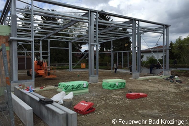 Der Erweiterungsbau und die Sanierung des bestehenden Feuerwehrgerätehauses in Hausen gehen nun doch zügig voran. Nach den Erd- und Betonarbeiten wurde das Stahlskelett gestellt. Derzeit sind die Monteure dabei die Seiten- und Dachelemente zu montieren. Bereits in den nächsten Wochen werden die Torelemente montiert.