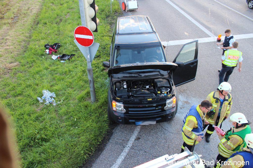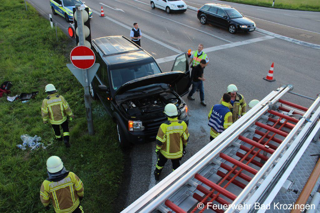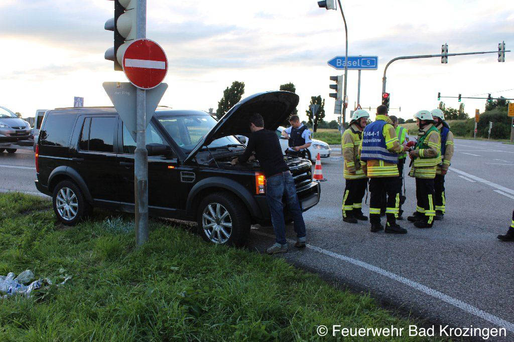 Im Abfahrtsbereich der Anschlussstelle Bad Krozingen BAB 5, auf die B31 fing ein Landrover im Motorbereich Feuer. Das beherzte eingreifen des Fahrzeugbesitzers verhinderte schlimmeres. Mit einem kleinen 2 kg Pulverlöscher und 10 Litern Mineralwasser konnte der Brand sofort wieder gelöscht werden. Die Feuerwehr sicherte die Einsatzstelle ab und kontrollierte das Fahrzeug mit der Wärmebildkamera. Anschließend konnte die Einsatzstelle an die Polizei übergeben werden und die Kräfte rückten wieder ein.
