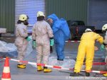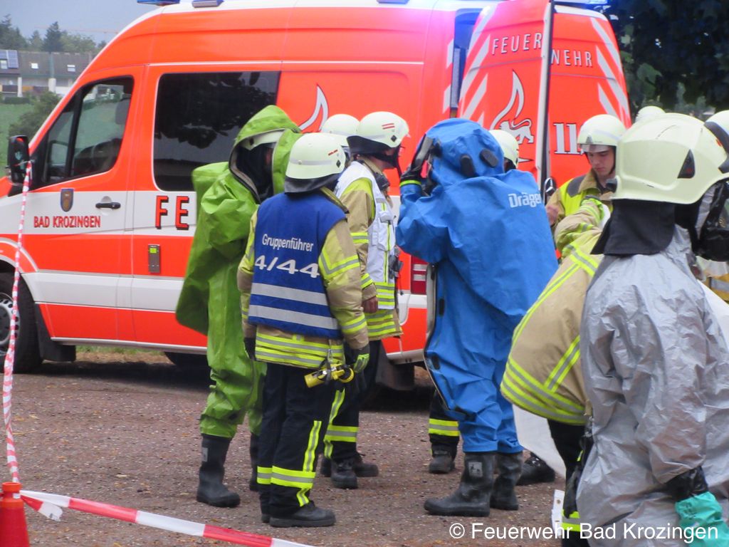 Den aus Ehrenkirchen, BK-Hausen und der Kernstadt Bad Krozingen angerückten Kräften bot sich eine recht realitätsnahe Lage: Bei Umladearbeiten in einer landwirtschaftlichen Halle hatte der Durchführende eine zunächst unbekannte Anzahl von Fässern von ebenso unbekanntem Inhalt beschädigt. Während die Besatzung des Einsatzleitwagens ihre Funktion als Leitstelle am Ort vorbereitete, ergab die durch einen Trupp mit umluftunabhängigem Atemschutz vorgenommene Erkundung Daten zum Schadensumfang und dem schadensverursachenden Stoff. Gleichzeitig konnte eine Person, der deutschen Sprache nicht richtig mächtig und offensichtlich vom ausgetretenen Stoff gesundheitlich deutlich beeinträchtigt, aus der Halle gerettet werden. Die entsprechenden Folgemaßnahmen unter Einsatz von schwerer ABC-Schutzkleidung (weitere Erkundung, Schließen der Leckstellen,..) folgten. Im Rahmen dieser Tätigkeiten konnte auch noch eine zweite Person aus der betroffenen Halle befreit werden. Währenddessen baute die Feuerwehr Ehrenkirchen unter exakter Einhaltung der Zeitvorgabe (15 min ab dem Eintreffen an der Einsatzstelle) die Personendekontamination auf.