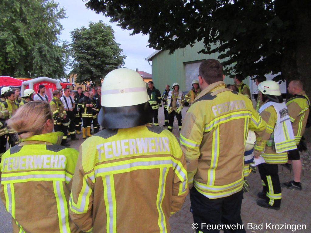 Die Übung selbst endete nach ca. 1und ½ Stunden mit einer ausführlichen Abschlussbesprechung, bei der Übungsteilnehmer und die zwei eingeteilten Schiedsrichter ausführlich über ihre Einsichten und Erfahrungen berichteten. Und als wäre dieses abendliche Training nicht schon genug auslastend gewesen: Mitten in die dem Kommando „Zum Abmarsch fertig“ folgenden Ab- und Aufräumarbeiten meldeten sich die Funkalarmempfänger der Wehr, die zu einem Brandeinsatz in einem Bad Krozinger Lokal riefen.