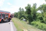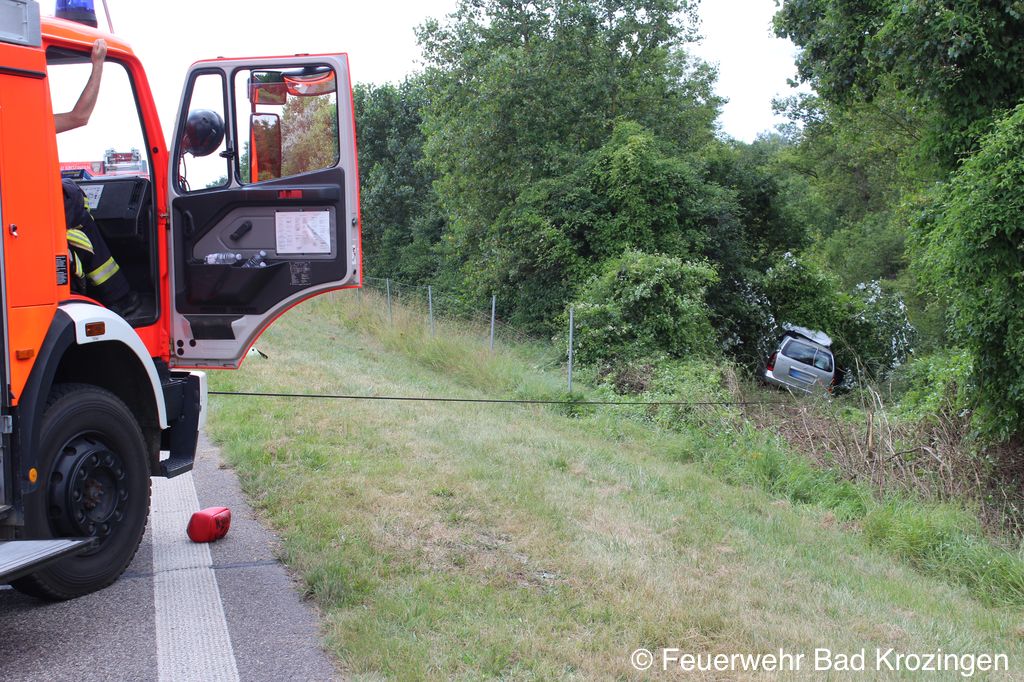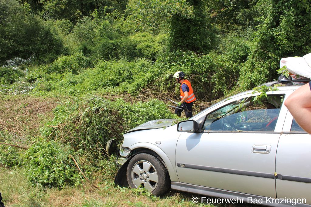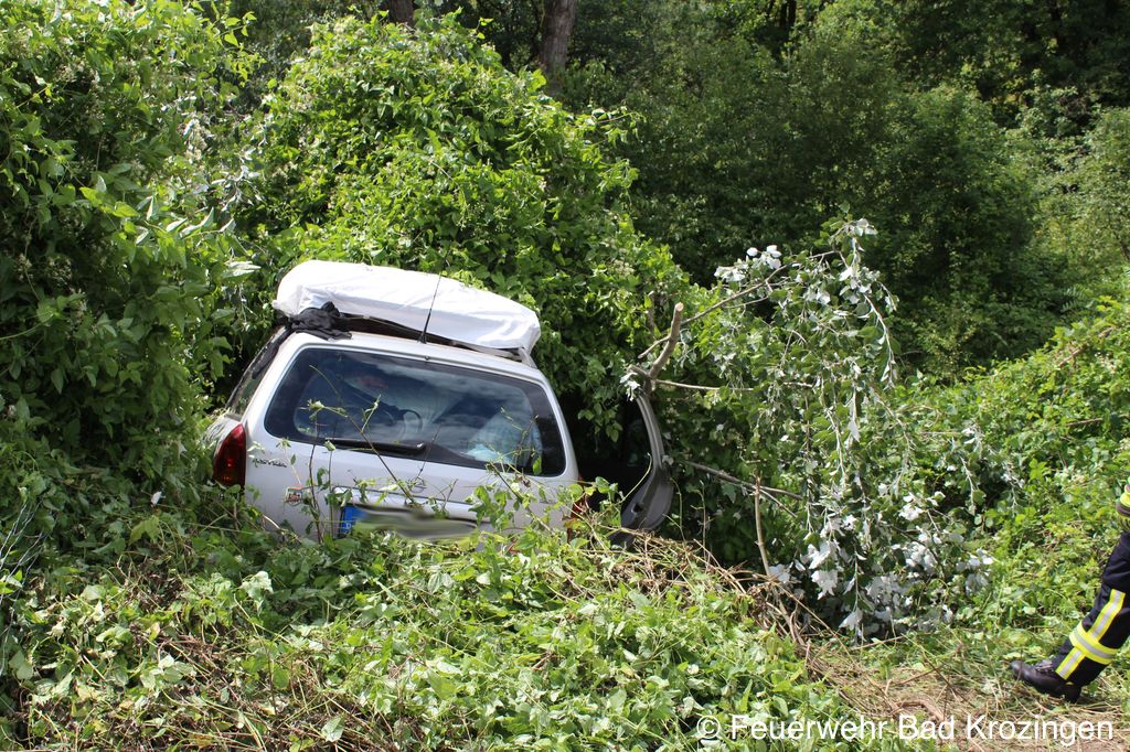 Ein PKW kam aus ungeklärter Ursache von der Fahrbahn ab, fuhr eine Böschung herab und kam im Unterholz zum Stehen. Die Feuerwehr stellte den Brandschutz sicher, anschließend wurde das Fahrzeug mittels Kettensäge und Seilwinde aus dem Gestrüpp geborgen. Die Einsatzstelle wurde im Anschluss an die Polizei ¸bergeben