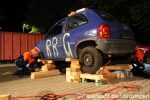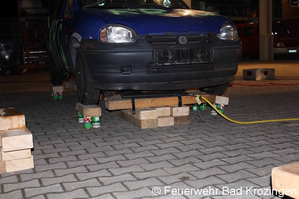 Nach einer kurzen Überlegungsphase machten sich Jungs und Mädels an die Arbeit. Mit Hebekissen (aufblasbare Kissen) wurde der PKW angehoben, um ein unkontrolliertes absenken des PKW zu verhindern wurde der PKW mit Holz unterbaut und gesichert. Nun schwebte der PKW förmlich in der Luft, lediglich ein paar Hölzer hielten den PKW. Vorsichtig wurden die Konservendosen platziert. Schritt für Schritt wurden jetzt die Hölzer entfernt und der PKW langsam auf die Dosen abgelassen. Der PKW setzte sich immer weiter auf die Dosen ab und tatsächlich die Dosen trugen den Kleinwagen.
