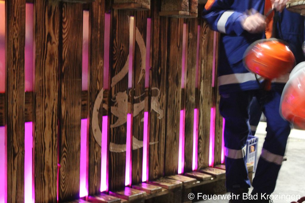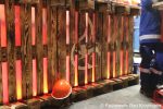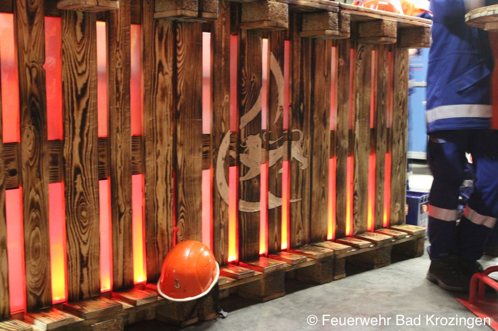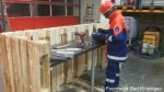 Schnell konnte man das Grundgerüst sehen. In Feinarbeit wurde dann das Feuerwehr Baden-Württemberg Signent eingefräst. Um der Bar einen heißen Look zu verpassen wurde die Paletten mit einem Brenner abgeflammt. Auch hier wurde wieder Feuerwehr Fachwissen geschult. Bevor mit dem Gasbrenner gearbeitet werden durfte wurde hierzu eine Lerneinheit über Propangas unterrichtet. Eigenschaften, Kennzeichnung und was passiert wenn Gasflaschen im Feuerwehreinsatz mit Hitze beaufschlagt werden wurden vermittelt.