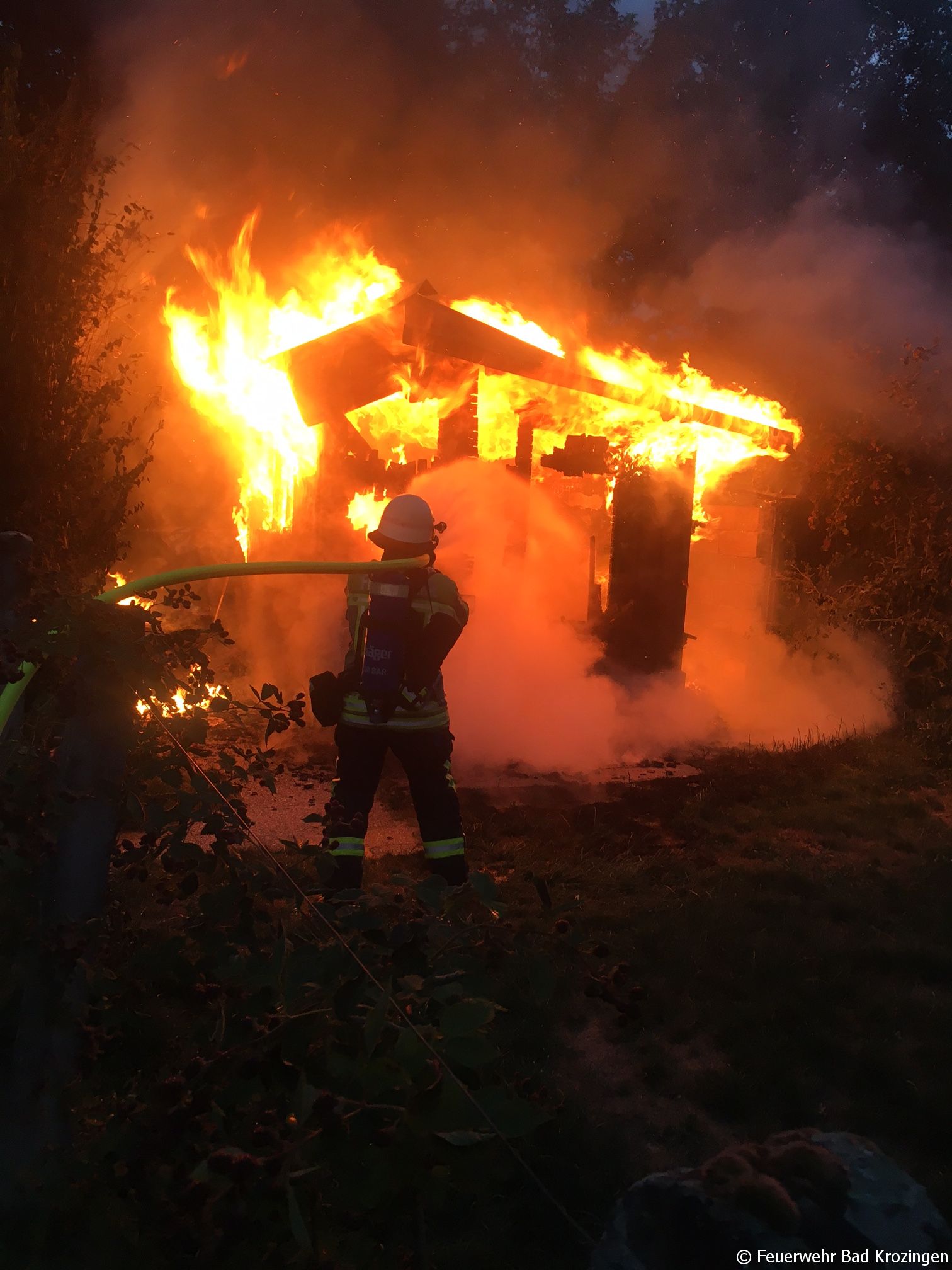 In den frühen Morgenstunden am 14.07.17 um 5:26 Uhr wurde die Freiwillige Feuerwehr Bad Krozingen zu einem Barackenbrand in der Nähe der Tennisplätze im Kurpark alarmiert. Der eintreffende Löschzug fand eine in Vollbrand stehende Gartenhütte vor. Durch ein energisches Vorgehen unter Atemschutz konnte der Brand schnell abgeriegelt und gelöscht werden. Durch das Feuer entstand glücklicherweise nur ein Sachschaden.