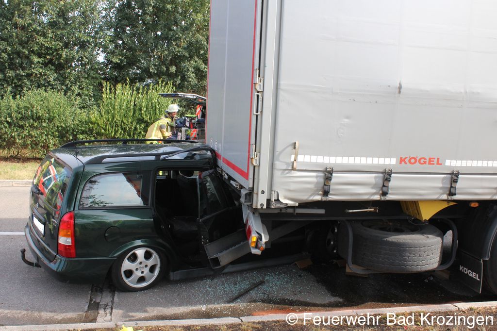 Am frühen Montagabend wurde die Feuerwehr Bad Krozingen Abteilung Hausen und Kernstadt zu einem Verkehrsunfall mit eingeklemmter Person auf die Autobahn alarmiert. Ein PKW ist aus ungeklärter Ursache auf dem Parkplatz von hinten unter einen stehenden Sattelzug gefahren. Der PKW und der LKW wurden erheblich beschädigt, der Fahrer wurde schwer verletzt. Beim Eintreffen der Feuerwehr war der PKW Lenker bereits vom Rettungsdienst aus dem Fahrzeug befreit worden. Die Feuerwehr sicherte die Einsatzstelle, stellte den Brandschutz sicher und beseitigte ausgelaufene Betriebsstoffe. Anschließend wurde der PKW mit der Seilwinde des Rüstwagens unter dem LKW hervorgezogen. Die Feuerwehr war mit 7 Fahrzeugen und 29 Kräften im Einsatz.