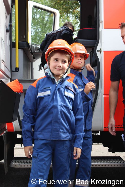 Danach erhielten insgesamt 25 Kinder ihre auf verschiedenen Wissens- und Praxisstufen erworbenen Abzeichen. Was die zwischen sechs und zehn Jahre alten Kinder an Kenntnissen nachweisen mussten, erläuterte während der Verleihung der Stadtjugendwart Stefan Geiler. Ein wichtiger Moment für zwei bisherige Angehörige der Kinderfeuerwehr folgte: Nach dem Erreichen des zehnten Lebensjahres wechselten Felix Fliegauf und Nico Hiß durch einen symbolischen Wechsel des Einsatzanzuges an Bord eines Löschgruppenfahrzeuges von der Kinder- in die Jugendfeuerwehr. Wie allenthalben zu hören war, sind also all die von den Betreuerteams der Kinder und Jugendlichen zu investierenden Stunden eine auch für die Sicherheit der Bevölkerung Bad Krozingens maßgebliche Zukunftsinvestition.