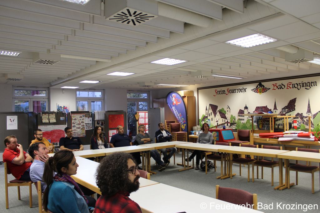 Die Gelegenheit Feuerwehrarbeit auch in der Praxis einmal näher in Augenschein zu nehmen, bot sich Interessenten aus Bad Krozingen und dem näheren Umland am Mittwoch dem 11. Oktober 2017. Die Feuerwehr Bad Krozingen hatte an diesen Abend einen sogenannten „Einführungslehrgang“ angeboten. Insgesamt 10 Teilnehmer, rekrutiert teils durch persönliche Ansprache, oder durch (natürlich vorher verabredetes) Anschreiben seitens der Schriftführung der Wehr, stellten sich an diesem mehrstündigen Abend einem insgesamt vier Punkte umfassenden Programm. In einem ersten Theorieblock stellte der die Veranstaltung leitende Brandmeister Andreas Kepper die Organisationsstruktur, die allgemeinen und eben auch ortsspezifischen Aufgaben der Rettungsorganisation vor. In Anwesenheit des Kommandanten der Nachbarwehr aus Sölden, die Ähnliches auf örtlicher Ebene gerade plant, stellte Kepper daraufhin beispielgebend die Organisation eines klassischen Löschangriffes vor.