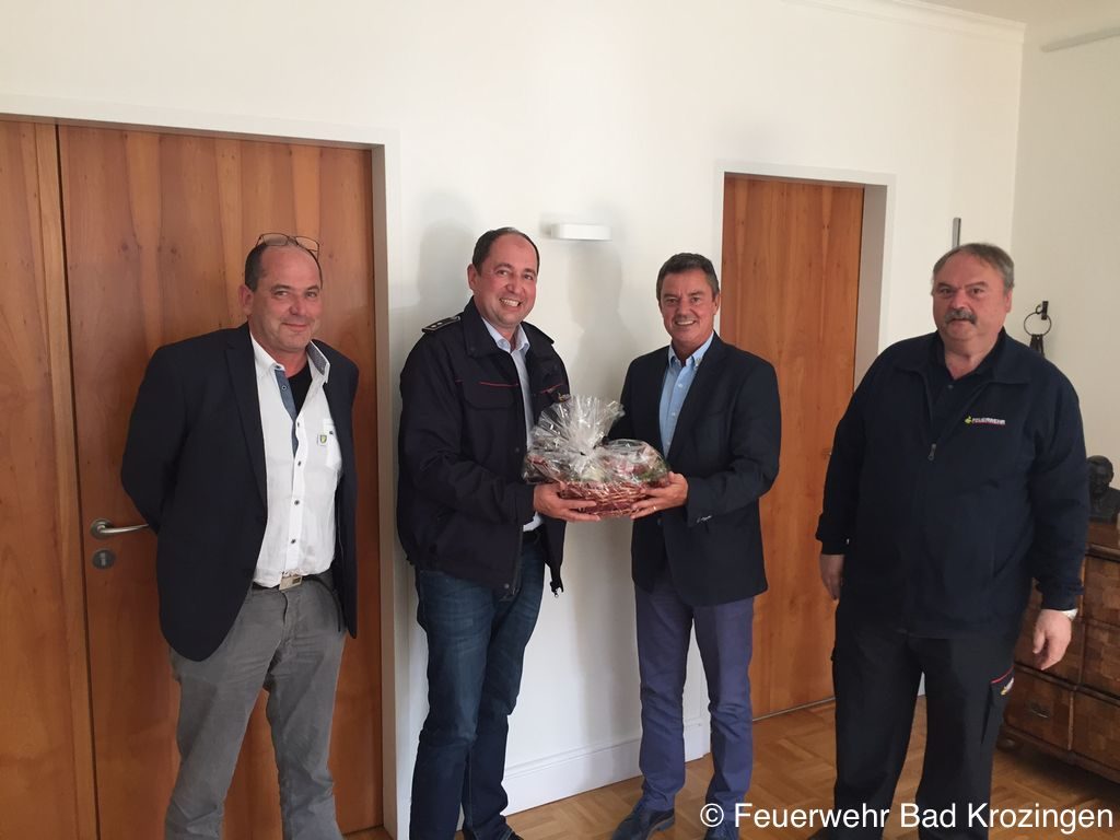 Die Feuerwehr konnte auch Bürgermeister Volker Kieber zum Geburtstag gratulieren. Bei einem Arbeitsgespräch über mögliche logistische Unterstützungen durch die Feuerwehr, für einen kurzfristig angedachten Transport in unsere Partnergemeinde, überbrachte die Feuerwehr die besten Glückwünsche und bedankten sich bei Bürgermeister Kieber für die Unterstützung im Bereich des Feuerwehrwesens.