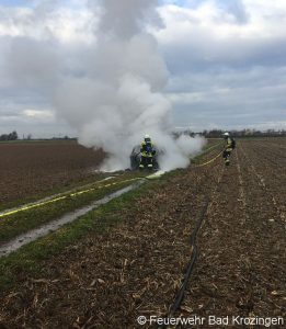 Am Montagvormittag wurde die Feuerwehr Bad Krozingen zu einem Fahrzeugbrand zwischen Biengen und Hausen alarmiert. Die Einsatzstelle befand sich auf einem schwer befahrbaren Feldweg. Trotz des schnellen Eingreifens der Feuerwehr brannte der Kleinwagen komplett aus.
