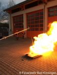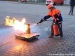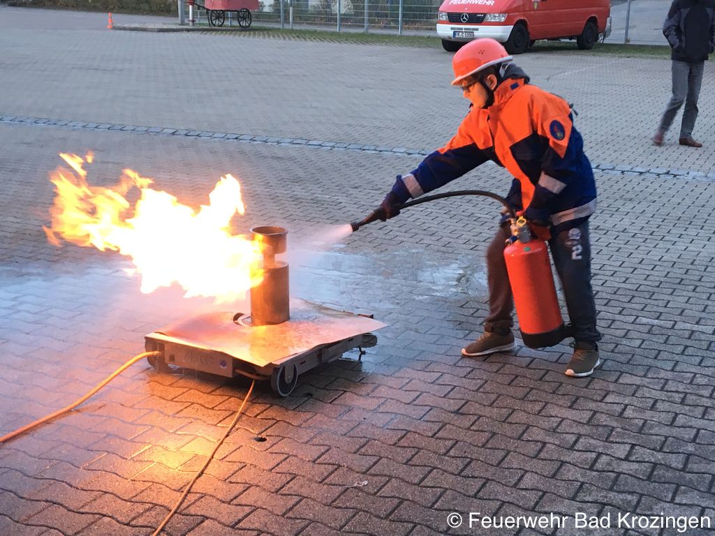 Um den Umgang mit einem Feuerlöscher zu lernen, übten die Kinder mit ihrem Ausbilder, Amin Yousefi aus der Freiwillige Feuerwehr Bad Krozingen, welcher sich auch in der Jugendfeuerwehr engagiert, am sogenannten Firetrainer. Mit dieser Übungsanlage lassen sich ein Mülleimer- oder Fettbrand simulieren. Die meisten Kinder wussten, dass man einen Fettbrand niemals mit Wasser löschen darf, doch die verheerende Auswirkung kannte niemand.