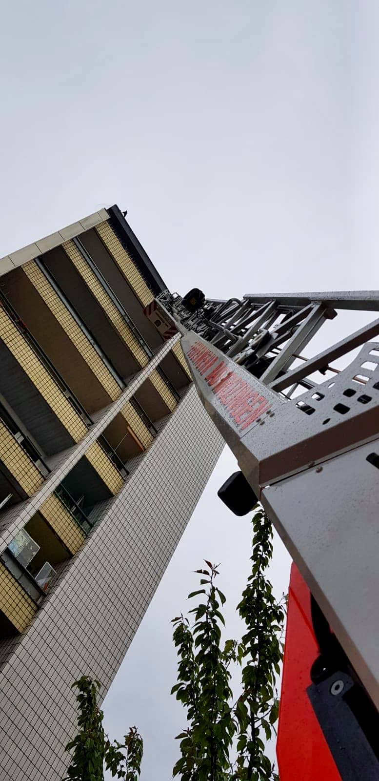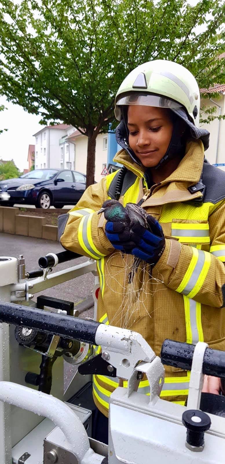 Am frühen Abend haben aufmerksame Fußgänger eine verletzte Taube an der Fassade am Hochhaus in der Bahnhofstraße entdeckt und die Feuerwehr alarmiert. Die Taube hatte sich in einem Netz verheddert und konnte sich selbst nicht mehr befreien. Per Drehleiter konnte sie aus ihrer misslichen Lage befreit und ans Tierheim übergeben werden.
