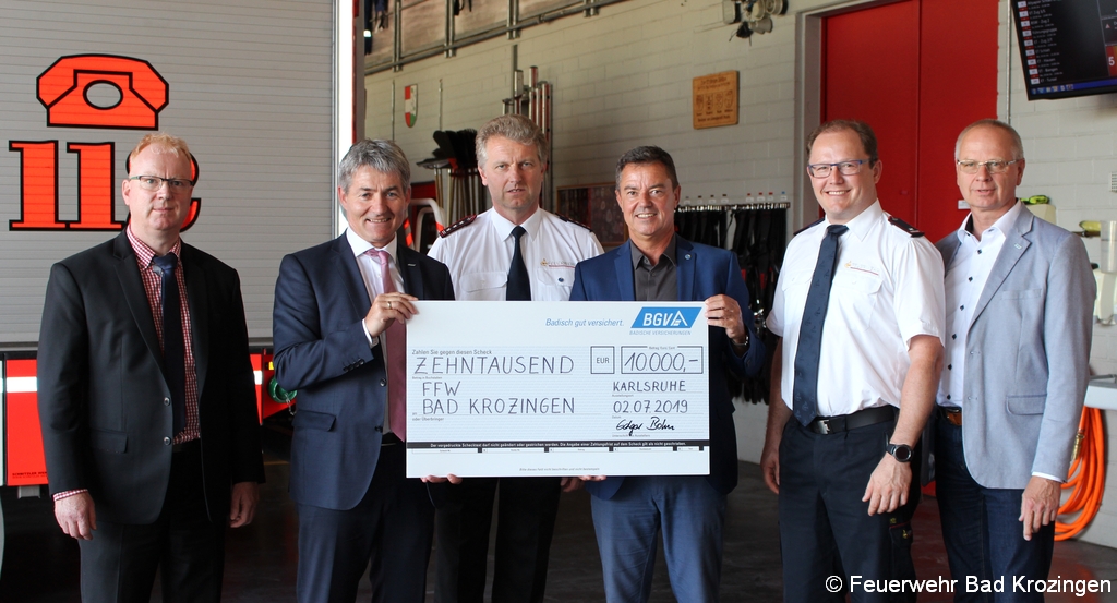 Die BGV-Versicherungsgruppe hat im Rahmen ihres Engagements zur aktiven Schadenverhütung 10.000 Euro an die Freiwillige Feuerwehr Bad Krozingen gespendet. Überreicht wurde der symbolische Scheck durch den BGV-Vorstandsvorsitzenden Edgar Bohn. „Ich bedanke mich für die großzügige Spende, die unsere Feuerwehr als Dankeschön für ihre wertvolle, ehrenamtliche Arbeit bekommen hat“, so Bürgermeister Volker Kieber. Edgar Bohn dankte den anwesenden Feuerwehrleuten für ihr wichtiges Ehrenamt. „Es ist ein großes Glück, dass es in Baden solch engagierte und gut ausgebildete Rettungsexperten gibt, die sich ehrenamtlich für den Schutz der Bevölkerung einsetzen.“