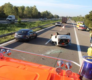 Am Morgen wurden wir zu einem Verkehrsunfall auf die Autobahn gerufen. Vor Ort lag ein Fahrzeug auf dem Dach, der Fahrer wurde bereits von den Kollegen der Medi-Ambulance und des DRK Kreisverband Müllheim e.V. versorgt. Die Feuerwehr stellte den Brandschutz sicher, die Polizei Freiburg nahm den Unfall auf. Nachdem der PKW vom Abschlepper aufgenommen wurde, konnten wir wieder einrücken.