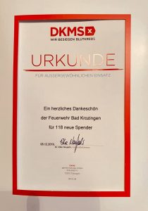 Bei unserem Mausöffnertag im Oktober hatten wir einen Stand für die DKMS-Registrierung. Vor kurzem bekamen wir eine Urkunde und sind sehr erfreut über 118 potentielle Spender. Wir bedanken uns bei der DKMS Deutschland für den Support und drücken die Daumen.